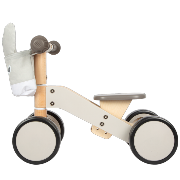 Dieser fahrbare Freund ist ein Highlight in puncto Funktionalität und Optik! Mit seinem warm-grauen Look und der süßen Lenkertasche in Gestalt eines Eselkopfes, wird dieser Rutscher zum niedlichen „Reitesel“, auf dem Kinder im Lauflernalter ihre ersten Fahrversuche machen können. Die Tasche bietet Platz für Kuscheltier, Trinkflasche und mehr, während der verstellbare Sitz und die optimierte Bauweise für Komfort und Beinfreiheit beim Schwungholen sorgen. Weiche Kunststoffräder ermöglichen ein leises und bodenschonendes Fahren. Der kompakte Holzrutscher überzeugt durch seine klare Formsprache und die funktionale Ausstattung. Die hinteren Räder stehen eng beieinander und bieten dadurch besonders viel Beinfreiheit beim Abstoßen. Für die nötige Sicherheit sorgen der stabile Stand, die Einschlagbegrenzung am Lenker und die Griffe aus Kunststoff, die ein Abrutschen der Hände verhindern. Der Sitz lässt sich in der Höhe sowie im Abstand zum Lenker verändern, sodass der Rutscher an die Größe des Kindes individuell angepasst werden kann. Die abnehmbare Tasche in Gestalt eines niedlichen Eselkopfes rundet das Design ab und bietet praktischen Stauraum für unterwegs. Die weichen Räder aus Kunststoff schonen empfindliche Böden und sorgen für ein leises Fahrvergnügen – egal ob drinnen oder draußen.