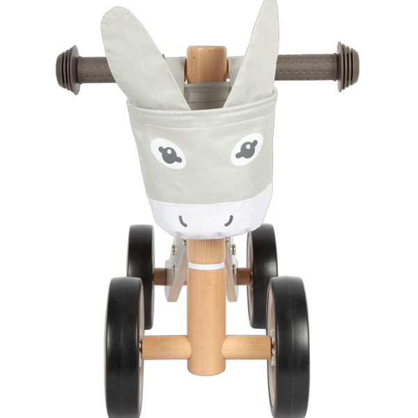 - Robuster Rutscher aus Holz mit praktischer, abnehmbarer Lenkertasche im Esel-Design für kleine Laufanfänger:innen