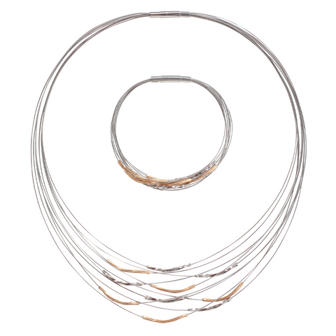 Hier laufen alle Fäden in subtiler Eleganz zusammen. Flexibel zu arrangierende Mittelelemente in Wellenform aus teilweise vergoldetem, rhodiniertem 925er-Sterlingsilber auf Edelstahlseilen. Mit Silberverschluss mit Magnetkern.
