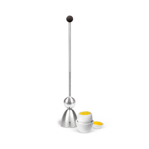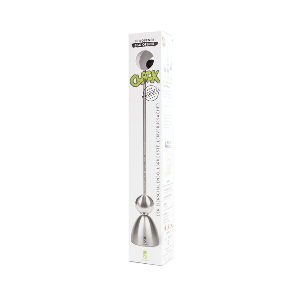 Den Eierschalensollbruchstellenverursacher bringen Sie wie folgt zum Einsatz: Metallkappe auf´s gekochte Ei setzen, die Schlagkugel hochziehen und einfach fallen lassen. An der entstandenen Sollbruchstelle kann die Eikappe wahlweise durch leichtes Verkanten mit dem „Clack“ oder mit Zuhilfenahme weiteren Bestecks vom Ei abgehoben werden.