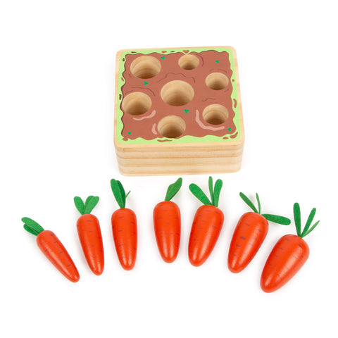 Möhrenziehen mal anders! Dieses farbenfrohe, kindgerechte Steck- und Sortierspiel aus Holz folgt der Montessori Pädagogik und animiert Kinder dazu, selbständig zu vergleichen, zu sortieren, zu zählen und zu strukturieren. Denn es gilt, die sieben unterschiedlich großen Karotten den passenden Löchern im "Beet" zuzuordnen. Grüne Filzapplikationen geben den Möhren ein realitätsnahes Design und eignen sich auch ideal als Rollenspielzeug für kleine Gemüsegärtner. Bei dem durch die Montessori-Pädagogik inspirierten Sortierspiel trainieren Kinder ganz nebenbei feinmotorische Fähigkeiten, Wahrnehmung sowie Größenverständnis und -zuordnung.