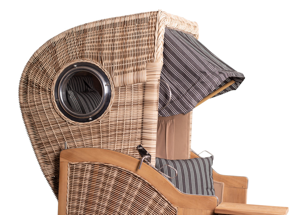 • Es ist immer noch ein Strandmöbel mit geflochtenen Wänden, stoffbezogen als Wind-, Regen- und insbesondere Sonnenschutz. Ausziehbare Fußstützen, Tischchen und herunterklappbare Markise runden das bekannte Erscheinungsbild ab.