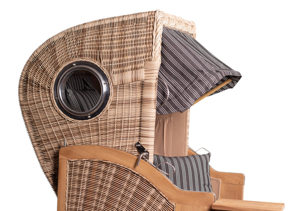 Strandkorb aus Korbgeflecht mit geschwungener Rückenlehne, rundem Fenster und Holzgestell in der Seitenansicht.