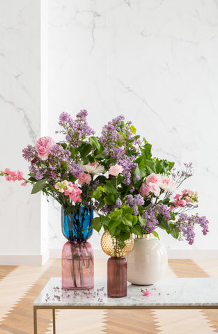 Drei Vasen „Marvelous Duo Blau Lila“, jede mundgeblasen und mit rosa und violetten Blumen gefüllt, sind auf einem Tisch mit Marmorplatte in einem hellen Raum mit einer hellen Wand mit Marmormuster und einem Holzboden im Chevron-Muster arrangiert.