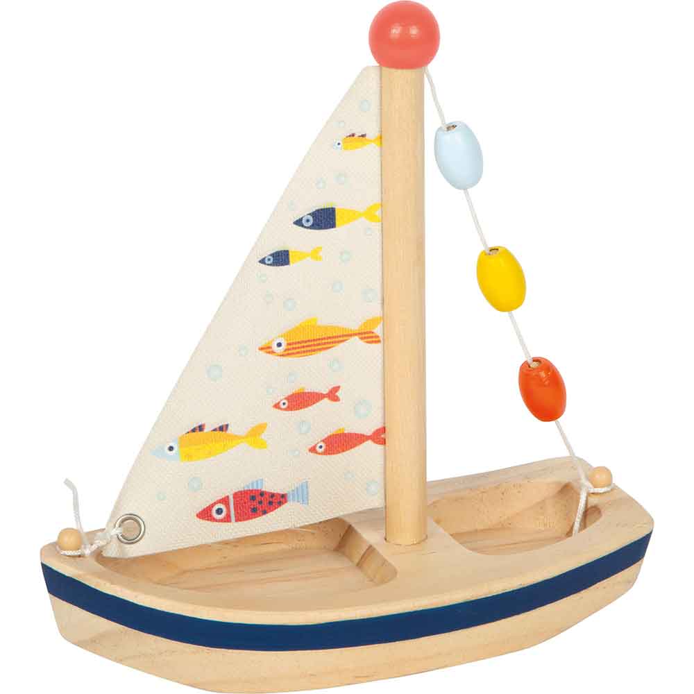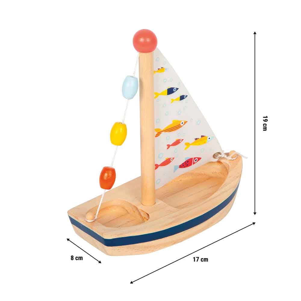 Ahoi kleine Entdecker! Dieses Holz-Segelboot lädt Kinder dazu ein, in die Welt des maritimen Rollenspiels einzutauchen. Die handliche Größe macht es zum perfekten Begleiter für alle Wasserabenteuer, sei es im heimischen Badezimmer oder beim sommerlichen Badeausflug. Als Holzspielzeug setzt es bewusst ein Zeichen für nachhaltiges Spielen – als Alternative zu Plastikbooten. Das Segel mit liebevoll illustrierten Fischmotiven, kleine Holzperlen als Designelemente, ausreichend Platz an Deck für kleine Spielfiguren und die robuste Bauweise machen das Boot zu einem langlebigen Wasserspielzeug mit besonderem Charme. Das nachhaltige Wasserspielzeug ist eine umweltfreundliche Alternative zu Plastikbooten – klein, handlich und perfekt für unterwegs. Nach dem Wasserspaß gut abtrocknen – und schon ist es bereit für die nächste Segeltour! Ideal als Geschenk für kleine Wasserratten!