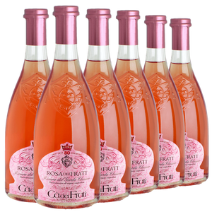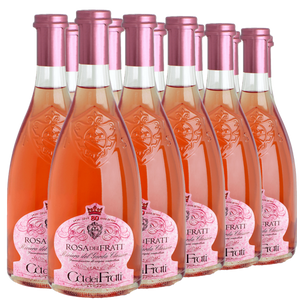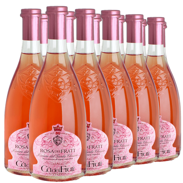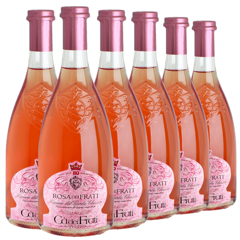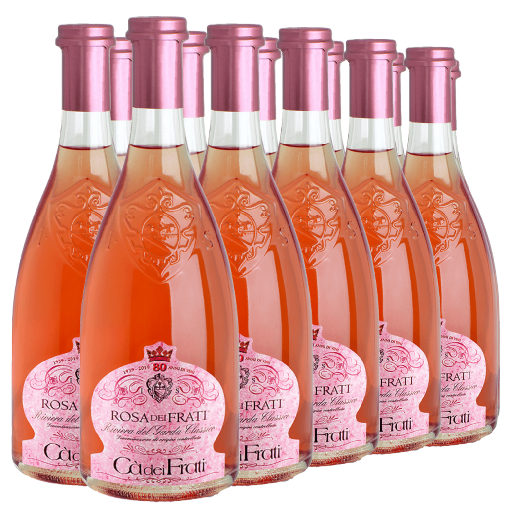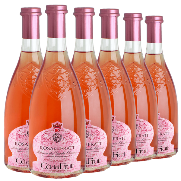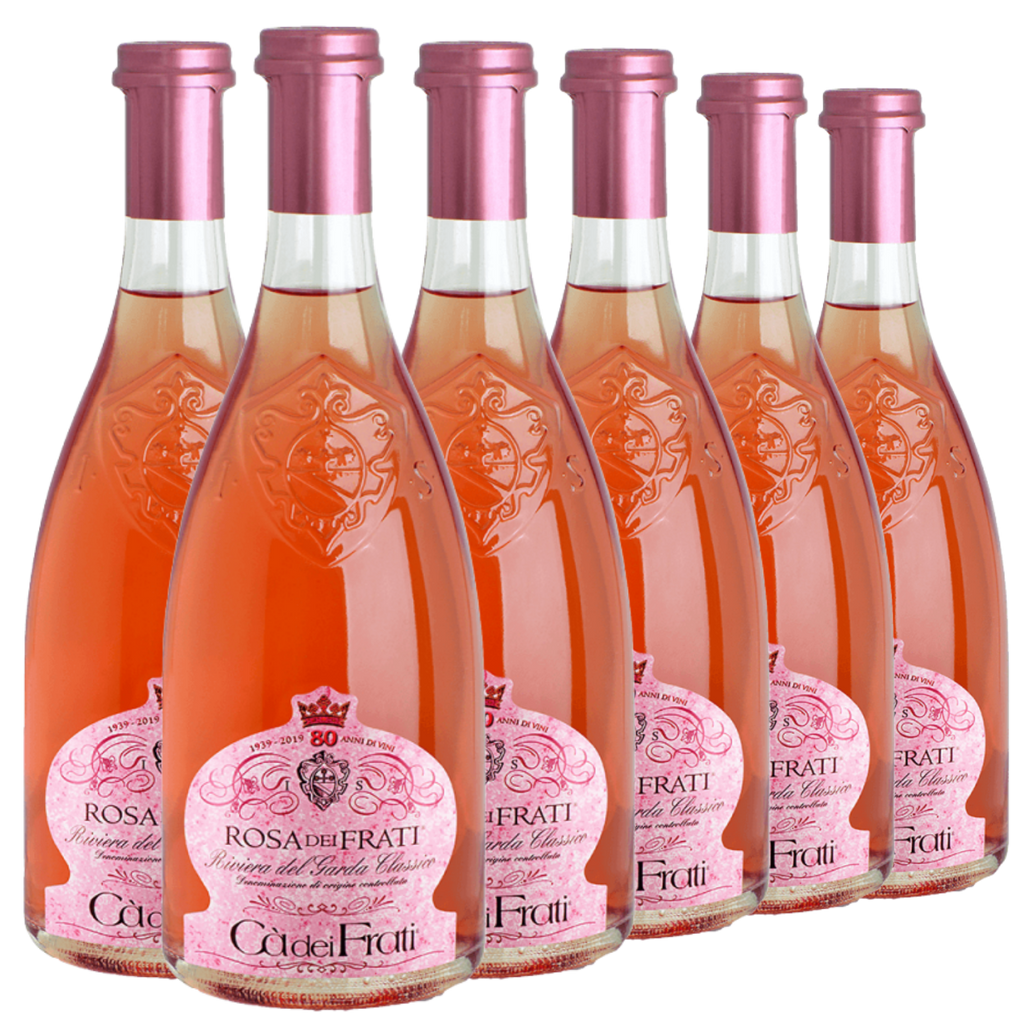 Sechs Flaschen Cà dei Frati Rosa dei Frati Roséwein mit rosafarbenen Etiketten und rosafarbenen Metallverschlüssen.