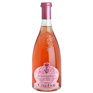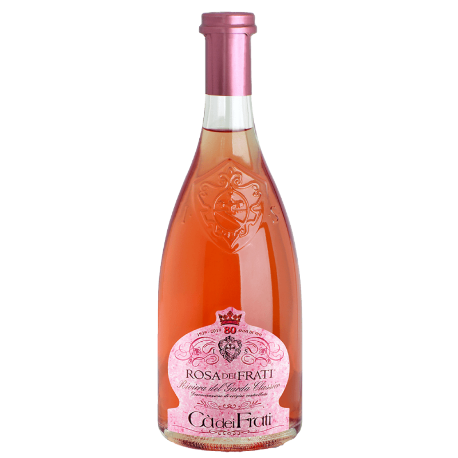 • Eine Flasche Cà dei Frati Rosa dei Frati Roséwein mit rosa Etikett und geprägtem Glasdesign.