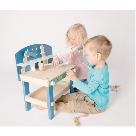 Kompaktes Heimwerken im skandinavischen Stil! Mit dieser Werkbank aus Holz kann auf kleiner Spielfläche handwerkliches Geschick erprobt werden. Durch Drehen, Sägen und Schrauben werden feinmotorische Fähigkeiten geschult. Sanfte Farben, klare Formen und das schlichte nordische Design sprechen Mädchen und Jungs gleichermaßen an. Inkl. 21-teiligem Zubehör.
